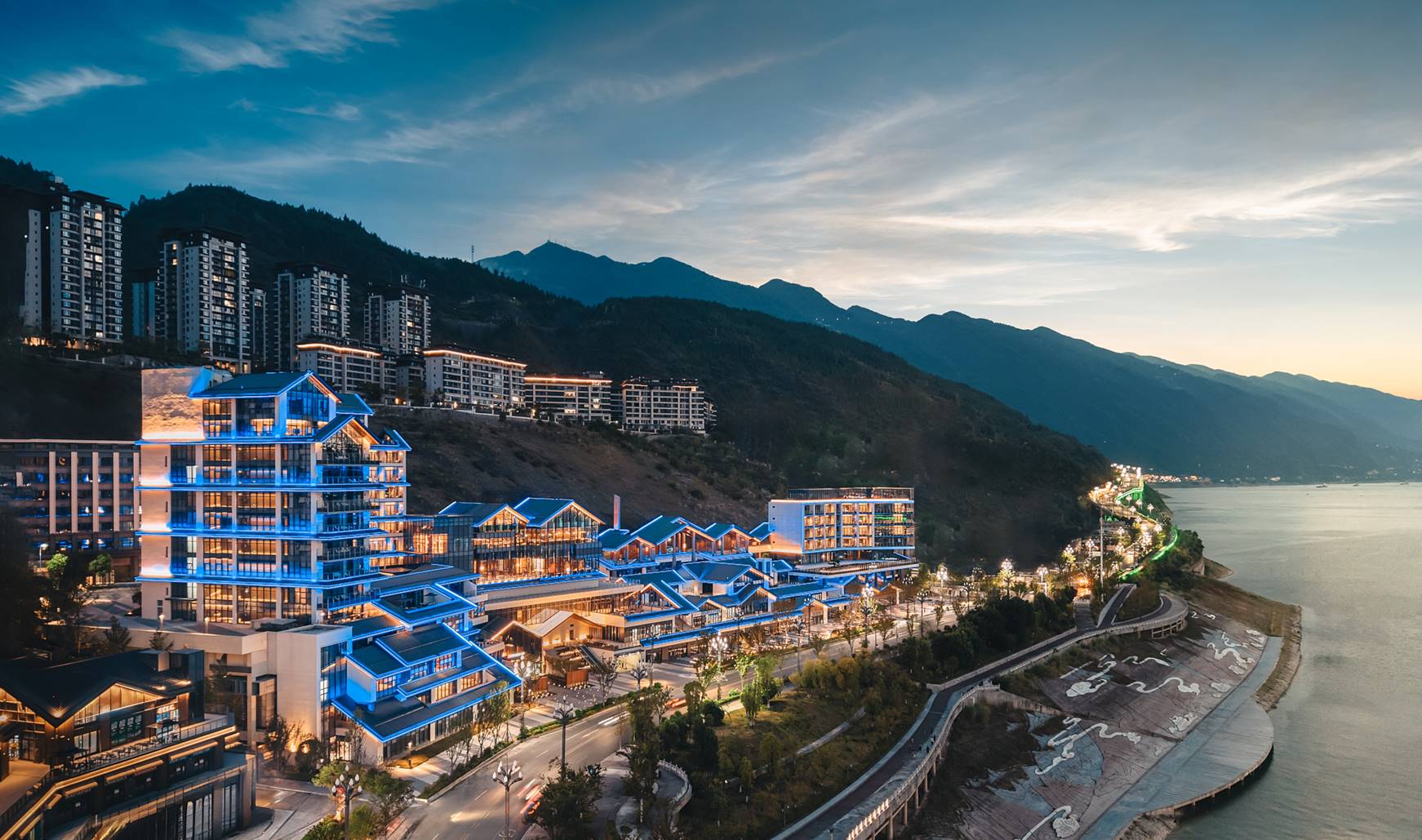 重庆巫山蔚景温德姆酒店,以现代独特 的邮轮造 型和变幻多姿的亮化景观点亮 大宁河畔,更与每 天必经的长江夜游 “三峡之光”和小三峡游船, 上演一场 璀璨夺目的灯光大秀,成为水岸联动的 热门打卡目的地。